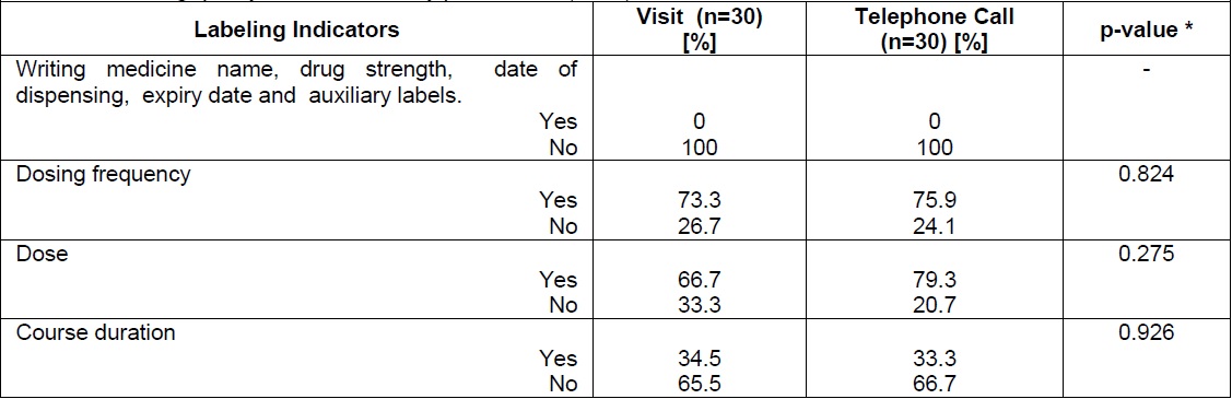 The labeling included dose frequency (73.3% of medicines in the visit group vs. 75.9% in the Telephone-call group; p-value=0.824), dose (66.7% of medicines in the visit group vs. 79.3% in the Telephone-call group; p-value=0.27) and course duration (34.5% of medicines in the visit group vs. 33.3% in the Telephone-call group; p-value=0.92). The details are summarized in Table 3.