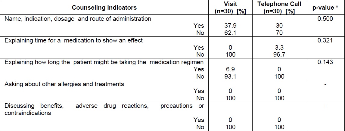 Methods: The simulated patient method was used in this study. Thirty pharmacies in Doha were randomly selected and further randomized into two groups: Face-to-Face (n=15) vs. Telephone-call (n=15) per simulated patient; 2 simulated patients were involved. Prescribing, labeling, dispensing and counseling practices were assessed. Data analysis was performed using Mann-Whitney and chi square tests at alpha=0.05.