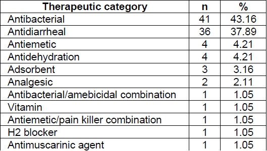 The most commonly dispensed drug category was ‘antibacterials (n=41; 43.16%), followed by antidiarrheals (n=36; 37.89%) and others. The details are presented in Table 5.