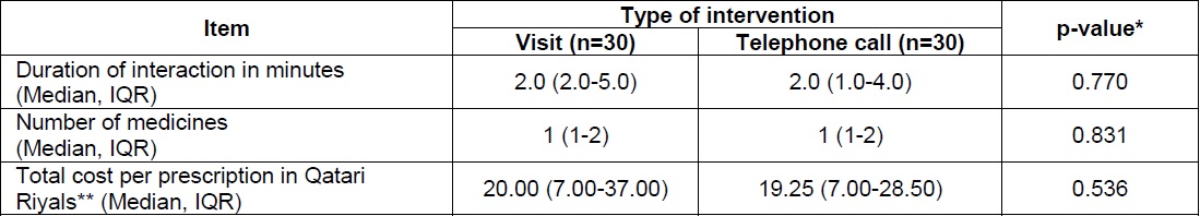 The median (IQR) time spent by the community pharmacist is listed in Table 7. It was observed that the duration of interaction in minutes was not significantly different between the groups [median (IQR); 2(2.0-5.0) in the visit group vs. 2(1.0-4.0) in the Telephone-call group, p-value=0.77]. It was noticed that in up to 75% of the cases, the cost was less than QAR30.00 (USD 8.24; 1 Qatari Riyal =0.27 USD). A higher number (30%) of the prescriptions charged less than QAR10.00 / USD 2.75, followed by QAR20.00-29.99 / USD 5.5-8.24 (28.3%) and 16.7% were from QAR10.00-19.99/USD 2.75-5.49. The cost per prescription ranged from QAR0 to QAR89/USD 0-24.44 (Table 7).