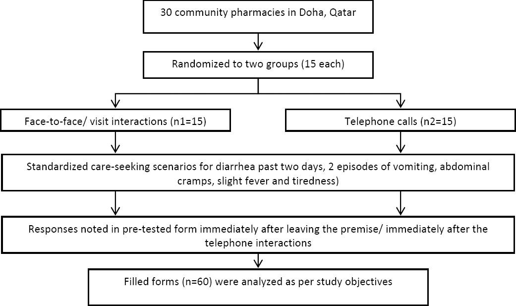 Of the 175 pharmacies in Qatar (on the list of pharmacies obtained from the Supreme Council of Health (SCH)), 30 community pharmacies in Doha, the capital city, were randomly selected. These 30 pharmacies were randomized using IBM SPSS Statistics for Windows, Version 21.0 (Armonk, NY: IBM Corp.) into 2 groups using a simple randomization technique: Group 1 (n=15): face-to-face interaction and Group 2 (n=15): telephone call interaction. For each pharmacy, two encounters were done (i.e. 30 visits for face-to-face interactions and 30 interactions through telephone calls, for a total of 60 encounters).