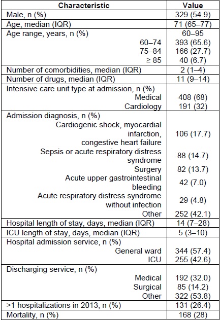 Data were obtained from 599 admissions of 486 older adults, of whom 131 (26.4%) had more than one hospitalization in 2013. The median age of participants was 71 years (IQR 65–77), and 54.9% were male. The main characteristics of the study population are shown in Table 1.