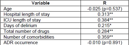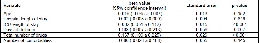 In the bivariate analysis, there was a statistically significant correlation between the number of PIM and the hospital length of stay (p<0.001), ICU length of stay (p<0.001), days of delirium (p<0.003), total number of drugs prescribed (p<0.001) and number of comorbidities (p<0.001) (Table 4). In the multivariate analysis, the number of prescribed PIMs was significantly associated with ICU length of stay and total number of medications (Table 5). The coefficient of determination (R2) of the model was 0.309.