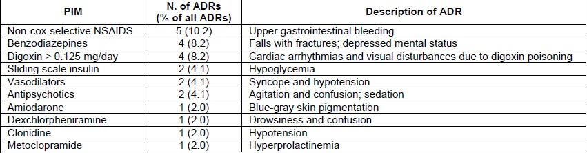 Methods: This study enrolled all critically ill older adults (60 years or more) admitted to medical or cardiovascular ICUs between January and December 2013, in a large tertiary teaching hospital. For all patients, clinical pharmacists listed the medications given during the ICU stay and data on drugs were analyzed using 2012 Beers Criteria, to identify the prevalence of PIM. For each identified PIM the medical records were analyzed to evaluate factors associated with its use. The frequency of ADRs and, the causal relationship between PIM and the ADRs identified were also evaluated through review of medical records.