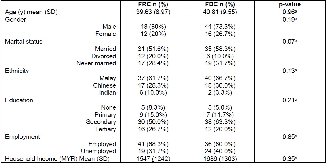 Demographic characteristics of the study population are shown in Table 1. Overall, the 120 patients were between the ages of 18 and 61 (41 SD=2.1 years). The patients were predominantly male [76.7% (n=92) vs. female (n=28, 23.3%)]. The majority of the study subjects were married 63.3% (n=76) compared to those were divorced (n=18, 15%) or who had never married (n=36, 30%). In terms of ethnicity, Malays made up the majority (n=77, 64.2%), followed by Chinese (n=35, 29.2%), and Indian (n=8, 6.7%). Approximately 56.7% (n=68) of patients had received secondary education, while 23.3% (n=28) had received tertiary education, 1.3% (n=16) had received primary education and 6.7% (n=8) had not been formally educated. Among the patients in this study, 64.2% (n=77) were employed, compared to 35.8% (n=43) who were unemployed. The average income of the study subjects was MYR1850 SD=1250, with two-thirds receiving a monthly household income of less than MYR (Malaysia Ringgit) 2000. There was no significant difference in demographic characteristics between the FDC and FRC groups.
