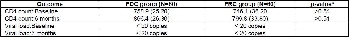 Clinical outcomes such as CD4 count, viral load and clinical symptoms of opportunistic infection were monitored in all patients (Table 2). During the study, no patients showed signs of an opportunistic infection or adverse effects from the medication taken. Initial baseline CD4 count readings for all 120 patients was 752 SD=66.5 cells/µL. After six months, the average CD4 counts increased significantly to 833 SD=54.7 cells/µL (p=0.04). All the participants in both the FDC and FRC groups (n=120,100%) achieved CD4 counts >500 cells/µL at baseline and six months. There was a significantly higher CD4 count increment in the FDC group compared to the FRC group at six months (FDC 108 SD=53.47 cells/µL vs. FRC 53.7 SD=30.59 cells/µL; p<0.0001). Similarly, the viral load for all patients (N=120) was <20 copies/ml at baseline. The viral load maintained at <20 copies/ml at six months. There was no significant difference between baseline and six months for the viral load between the FDC and FRC subjects.