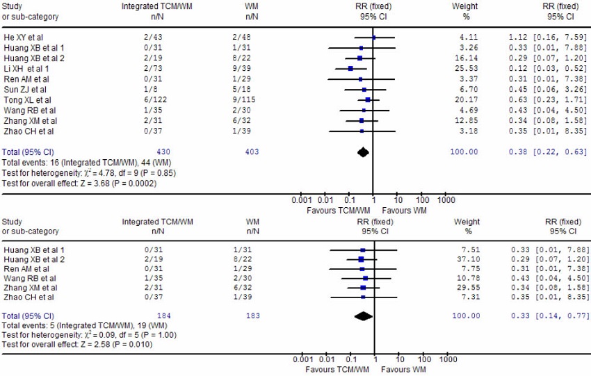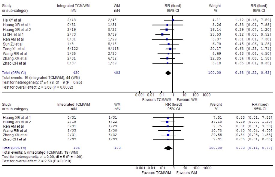 In this present study, we summarized the results of the findings from both RC studies and NPC studies using the meta-analysis. There is no convincing evidence to support that integrative TCM/WM treatment could significantly decrease the mortality rate, which contrasted from the findings from Liu et al. study.4 Although we first noted a significant reduction in mortality rate with the integrative treatment when ten studies were included, further subgroup analyses failed to consistently find a significant difference in mortality rate in those RC studies with larger sample sizes and adequate information of randomization. This suggests that the previously observed positive effects of integrative treatment were likely due to the inclusion of those studies of poor quality.