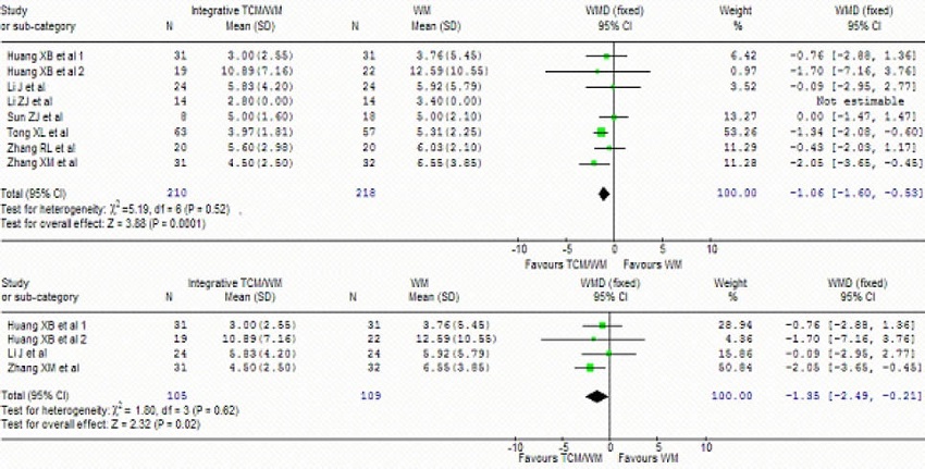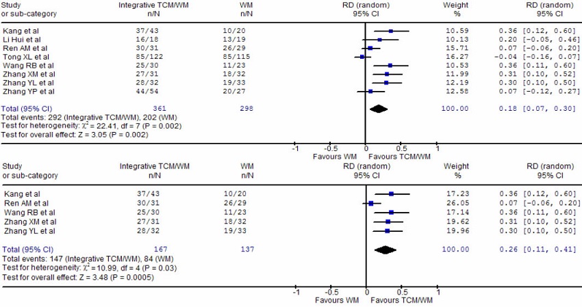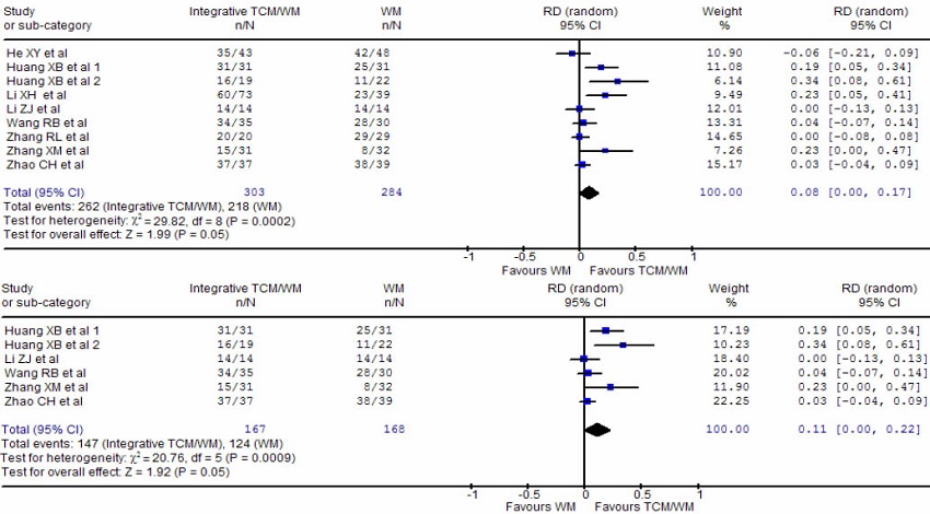 Data were analyzed using RevMan 4.27 (Cochrane Collaboration, Oxford, UK). Statistical significant level was predetermined at the 0.05 level. The effects of integrative treatments were presented as risk ratio (RR), rate difference (RD) for dichotomous outcomes, and weighted mean difference (WMD) for continuous outcomes. The RD was defined as the difference of occurrence rate of events between integrative treatment group and WM alone group.