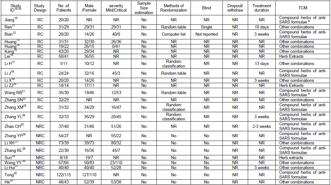 The findings of this study should be considered within the context of limitations. First, due to the limited number of published RCT studies, our analysis also included some NRC studies. However, the sudden outbreak of this new and serious disease precluded well controlled clinical studies during the epidemic. Despite twenty-four clinical studies, most of them had low methodological quality according to the Jadad scores. Second, the variation in treatment regimens, particularly the wide range of TCM in concoction constituents, dose, route of administration, and duration of therapy, became a major obstacle to a clear interpretation of the results. Third, there were only three studies that reported the outcomes on the basis of severity of disease. The data were insufficient for conducting an effective subset analysis on the severity of disease. Fourth, diagnoses of SARS during the outbreak were not confirmed by laboratory evidence of the SARS-Cov infection. As a recent study indicated, out of 28 patients, only 24 (85.71%) were eventually confirmed as having SARS according to the T-PCT detection of SARS-Cov RNA.41 Fifth, because of the variety of TCM and WM under study, it would have been difficult to meaningfully measure the rate of adverse events related to treatments. Therefore, such an analysis of adverse events was not conducted as part of this present study.