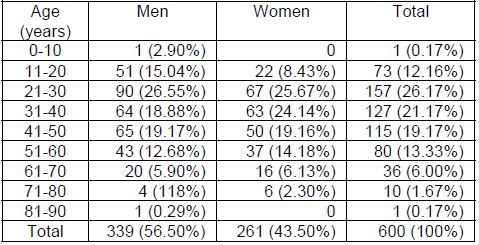 During the 4 months study period, a total of 600 patients visited the Medicine OPD (Table 1). A total of 122 ADRs were reported in 600 patients. The gender distribution among the patients who experienced ADRs was comparative with males having experienced more number of ADRs as compared to the females (64 versus 58). The frequency of ADRs was maximum (43.4%) in patients with age group of 25-50 years; next susceptible age group was that of elderly patients (more than 50 years) with 40.1% of ADRs. The number of ADRs in less than 25 years age was lowest (14.7%).