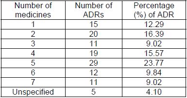 As expected polypharmacy had a major influence on the occurrence of ADRs with a total of 71 (58.0%) ADRs observed in patients receiving 4 or more medications concurrently (Table 2). Conversely, 46 (37.7%) ADRs were detected in patients on 3 or less medicines. The frequency of ADRs associated with different routes of administration was as follows: oral (n = 110), parentral (n = 11) and topical (n = 1).