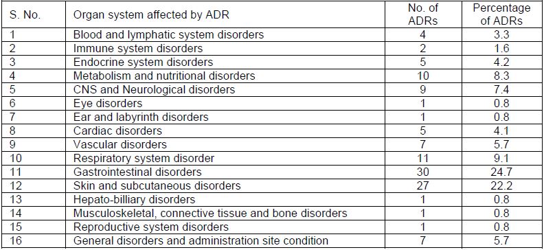 The gastrointestinal side effects (e.g. gastritis, dysphasia etc.) were at the top with 24.7% followed by skin and subcutaneous disorders (22.2%). Other main groups were metabolic and nutritional disorders (8.3%), CNS and neurological disorders (7.4%). The detailed description of organ systems affected by ADRs is shown in Table 3.