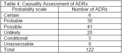 Out of a total number of 122 ADRs, 6 (4.9%) were classified as certain, e.g. hypersensitivity reaction with intravenous contrast medium, skin reaction with cefotaxime injection, itching and dermatitis with etophylline tablets and hypoglycemia with glibenclamide tablets. Thirty six ADRs (29.5%) were considered probable e.g. dry cough with enalapril and dysphasia with furosemide tablets. Forty one (33.6%) were classified as possible e.g. loss of appetite and pain in abdomen with antitubercular medicines and breathlessness with nimesulide and metoprolol. Eight ADRs (6.6%) could not be categorized and were placed under unassessable category e.g. itching with antitubercular drugs, mental depression with metoprolol, (Table 4).