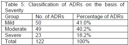 Of the 122 ADRs, 50 (41.0%) were found to be mild e.g. cold extremities with atenolol, 49 (40.2%) moderate e.g. dry cough with ramipril and 23 (18.2%) severe e.g. subcutaneous bleeding with carbimazole. Most of the severe ADRs were associated with antitubercular, oral hypoglycemic drugs, insulin and heparin. These were reported more commonly with injectables as compared to oral medications. Ten serious and the life threatening ADRs were also reported e.g. hepatitis with antitubercular medicines and anaphylactic reactions with iopromide (i.v. contrast medium). Drug induced morbidity is an important cause of hospitalization and is associated with significant mortality. Most of the ADRs observed in our study were either mild or moderate (Table 5).