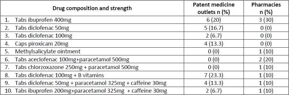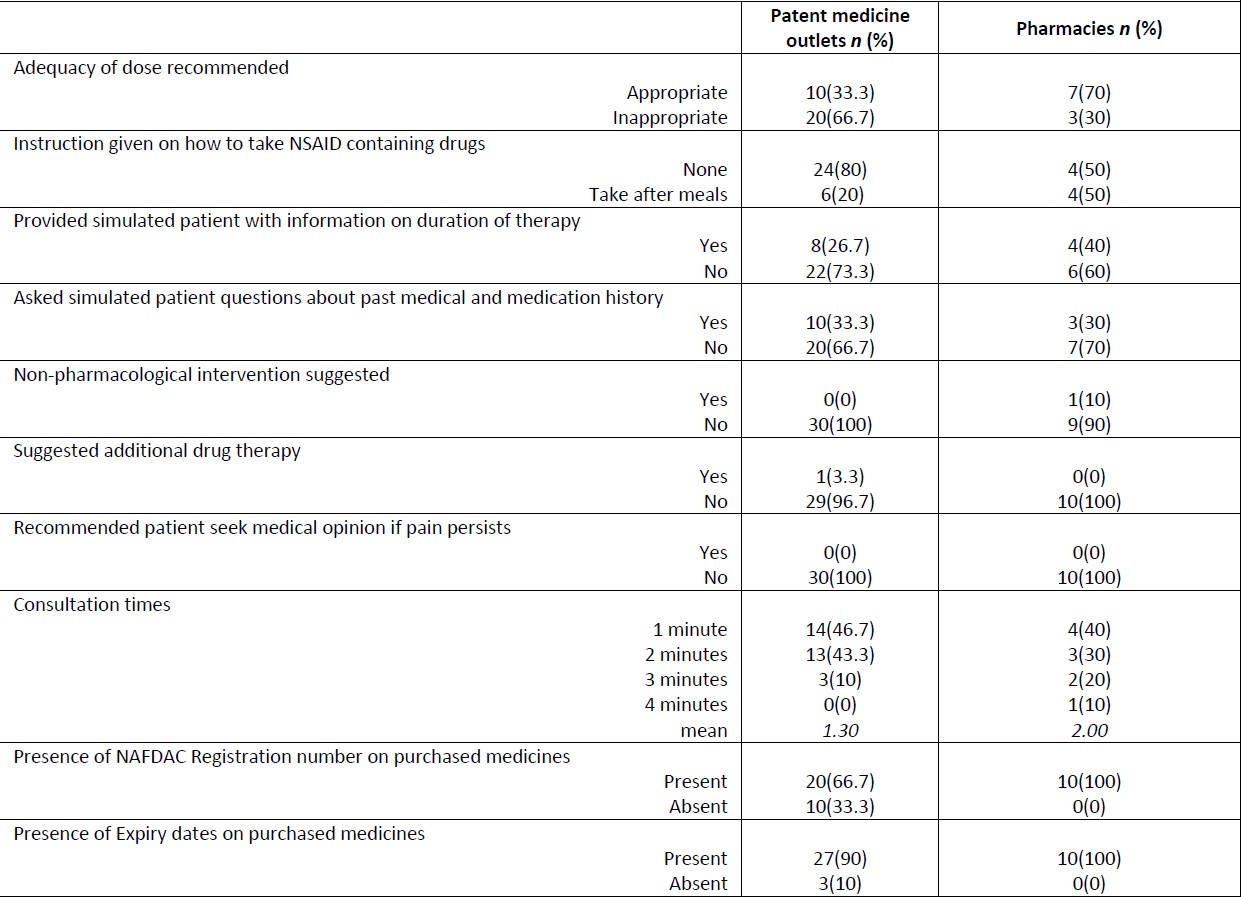 Results: A wide variety of therapeutic agents were recommended for the simulated patient. Majority of these drugs were oral analgesics and contained NSAIDS either alone or in combination. Less than half of both patent medicine outlets and pharmacies (26.7% and 40% respectively) provided the simulated patient with information on duration of therapy, and asked the patient questions about their past medical and medication history (30% and 33.3% respectively). All analgesics purchased from the pharmacies were registered with the Nigerian drug regulatory agency and had expiry dates compared to only 66.7% and 90% of those bought from patent medicine outlets. Interviewed drug vendors admitted to obtaining a large amount of their knowledge on analgesics from drug information leaflets and prior learning. They also showed some knowledge deficits when questioned on side effects of analgesics and appropriate drug selection in the hypothetical scenarios.