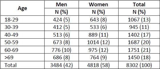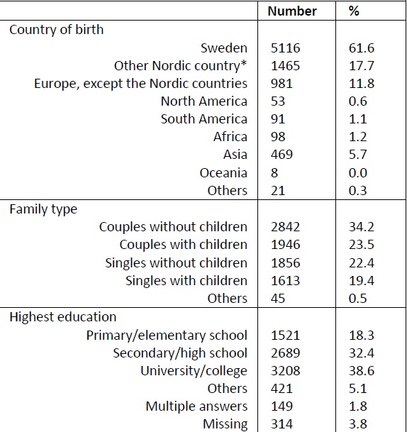 A total of 8,302 people (42%) answered the questionnaire; 57% used the paper survey, 43% the web-based version. Gender and age distributions were as shown in Table 1, while distributions by country of birth, family type and highest education are presented in Table 2.