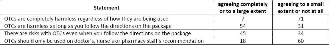 A total of 54% (56% men, 52% women) agreed completely or to a large extent with the statement that OTCs are harmless as long as you follow the directions on the package, while 31% (29% men, 33% women) responded that they agree to a small extent or not at all.