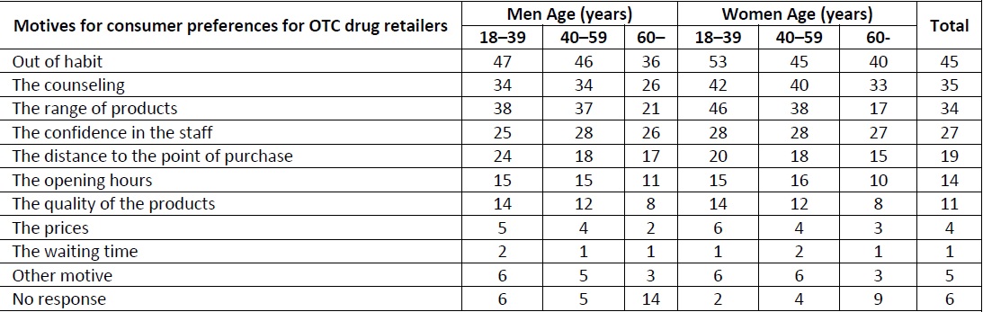 Different distributions of responses due to other demographic factors were also found. For example, in 18% of couples with children vs 10% in couples without children the opening hours is a motive for the choice of OTC drug retailer. The corresponding proportions in single parents vs. singles without children were 15% and 11% respectively.