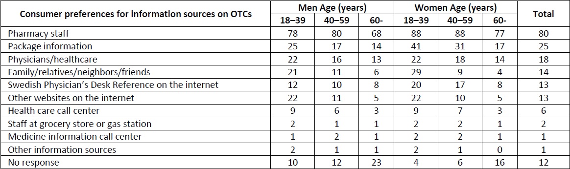 A majority, 68-88%, of all age groups chose the pharmacy staff as a primary source of information, while reading the package text was the second most common response option, albeit not nearly as frequent (Table 5). Young men and women ask family/relatives/neighbors/ friends, as well as physicians/healthcare, more frequently than middle-aged and older respondents, and furthermore they seek information on websites on the internet to a greater extent.