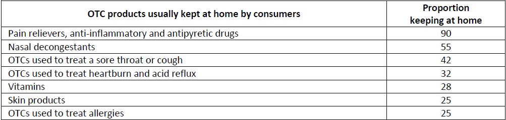 More than 93% of the respondents reported that they have one or more OTCs at home and almost 90% usually have OTC pain relievers, anti-inflammatory and antipyretic drugs in their home medicine cabinet (Table 6).