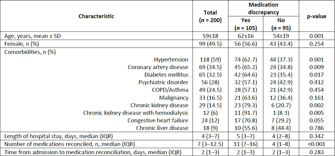 Out of the 224 patients screened for inclusion using the every third sampling method, twenty-four patients were excluded due to absence of pharmacist medication reconciliation note in the EHR (n = 19), lack of data to retrospectively calculate CrCl (n = 2), and inability to interview the patient due to clinical conditions (n = 3). The study population included for analysis was 200 patients.