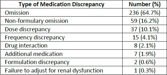 Results: Three-hundred and sixty-five medication discrepancies were identified out of the 200 included patients. The four most common discrepancies were omission (64.7%), non-formulary omission (16.2%), dose discrepancy (10.1%), and frequency discrepancy (4.1%). Twenty-two percent of pharmacist recommendations were implemented by the prescriber within 72 hours.