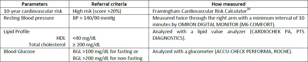 Participants were recommended to visit their physician if they had one of the following criteria: an estimated CVD Framingham risk factor above 20%, BP greater than 140/90 mmHg, TC equal to or greater than 200 mg/dL, HDL-C lower than 40 mg/dL, and BGL greater than 100 mg/dL for fasting or 200 mg/dL for non-fasting. A special referral letter signed by a clinical pharmacist was designed to provide a summary of the screening results.