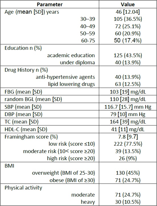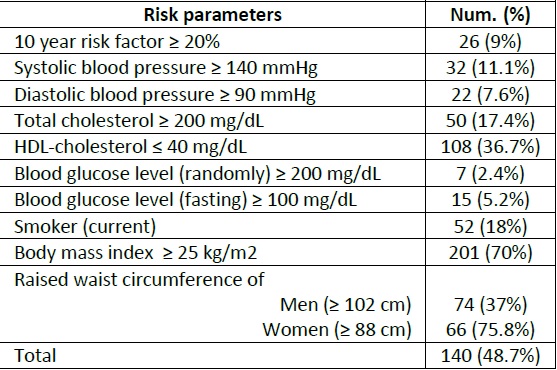 A total of 146 individuals (50.8% of those screened) received a referral letter to seek advice from their physician. Among them, low HDL-C was the most common risk factor (76%) followed by high TC (34%), increased DBP (22%) and SBP (15%), high FBG (15%), and a 10-year risk factor greater than 20% (9%). The results of the cardiovascular risk factor screening have been demonstrated in Table 3. Among patients who were referred to a physician for a SBP >140 mm Hg or a DBP >90 mm Hg, 12 (30%) individuals had a previous diagnosis of hypertension and were already taking antihypertensive medications. In the study population, 2.4% had suspected diabetes and 5.2% had impaired glucose tolerance (IGT).