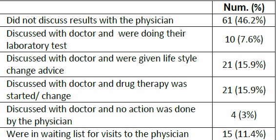 During the follow up, 132 participants out of 146 high-risk individuals were contacted via telephone. The reasons for unsuccessful follow up in the remaining 14 people were because of missing telephone numbers or missed calls after two attempts. Among those contacted, 71 participants (54%) discussed their health screening results with physician. Of the visited patients, 21 (15.9%) were recommended to change their lifestyle, and 21 (15.9%) individuals received underwent drug therapy (Table 4).