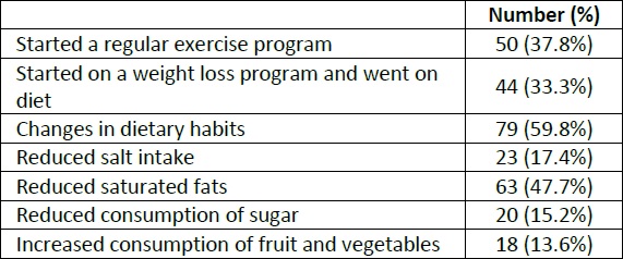 Further analysis revealed a significant difference between gender and physician visit rates (p‹0.009, 59.4% of men versus 30.8% of women). More than half of the individuals (62.2%, 90 patients out of 132) reported that they had one or more lifestyle changes. The most common alteration was dietary modification (Table 5). Comparison of parameters based on gender has been illustrated in Table 6. In regard to smoking, systolic and diastolic blood pressure, mean Framingham score, and fasting blood glucose, there were significant differences between two groups (p<0.001) and women had lower measures than men. However, the HDL was considerably higher in female group (p<0.001).