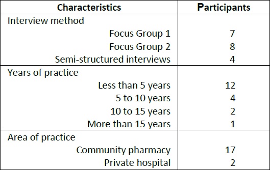 A total of 19 pharmacists participated in two focus groups and four semi-structured interviews. The focus groups ran for approximately one hour and semi-structured interviews each lasted 30 minutes on average. Mean age (SD) of the participants was 29.7 (SD=4.7) years, with a range of 25 to 41 years. Demographic characteristics of participants are listed in Table 1.