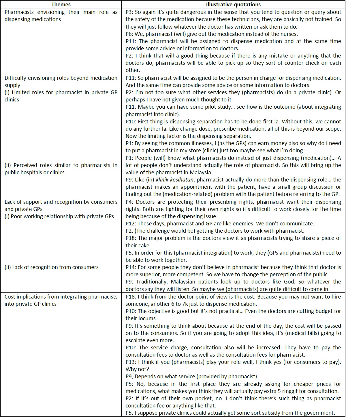Results: Four major themes were identified: (1) Limited potential to expand pharmacists’ roles, (2) Concerns about non-pharmacists dispensing medicines in private GP clinics, (3) Lack of trust from consumers and private GPs, (4) Cost implications. Participants felt that there was a limited role for pharmacists in private GP clinics. This was because the medication supply role is currently undertaken in private GP clinics without the need of pharmacists. The perceived lack of trust from consumers and private GPs towards pharmacists arises from the belief that healthcare is the GPs’ responsibility. This suggests that there is a need for increased public and GP awareness towards the capabilities of pharmacists’ in medication management. Participants were concerned about an increase in cost to private GP visits if pharmacists were to be integrated. Nevertheless, some participants perceived the integration as a means to reduce medical costs through improved quality use of medicines.
