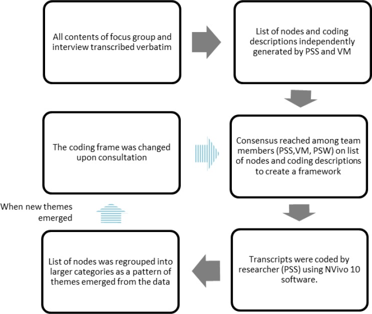 Data was analysed using a general inductive approach to derive findings in the context of focused evaluation questions (Figure 1).37 Transcripts were read several times by two researchers (PSS, VM) to independently create a list of nodes and coding descriptions. An agreed framework of nodes was generated from a consensus among team members (PSS, VM, PSW). The researcher (PSS) coded all the transcripts based on the agreed framework of nodes using the NVivo 10 software (QSR, Melbourne). The nodes were regrouped into larger categories as a pattern of themes emerged from the data. Emerging themes were developed by studying the transcripts repeatedly and considering possible meanings and how these fitted with developing themes. Themes generated were then checked with the original transcripts to make sure they were grounded in the data.