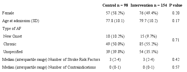 A total of 252 eligible patients were enrolled between May 1, 2001 and Feb 28, 2002. Ninety-eight patients were enrolled in the control group between May 1, 2001 and Jul 25, 2001, while 154 patients were enrolled in the intervention group between Sep 20, 2001 and Feb 28, 2002. There were no significant differences in demographics between the two groups at entry. Patients were closely matched in their type of atrial fibrillation. (Tables 1 and 2)