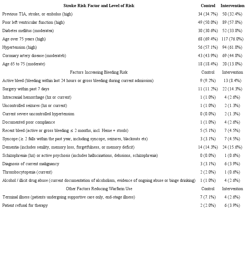 As in the control group, patients in the intervention group were identified by an EKG consistent with atrial fibrillation. However, this list was then sent to the pharmacist assigned to follow the atrial fibrillation patients. This pharmacist determined if the patient was on warfarin from the medication administration record. If so, no further intervention was made. For patients not currently receiving warfarin, the patient chart was reviewed for confirmed or suspected non-valvular atrial fibrillation. Confirmation of non-valvular atrial fibrillation was obtained from the patient’s physician, if necessary. A medication history was obtained in patients with confirmed or suspected non-valvular atrial fibrillation, focusing on current and prior antithrombotic use, risk factors for bleeding, and medications that interact with antithrombotic therapies through chart review and direct patient interview. A summary of the patient’s therapy and a recommended plan was developed and communicated to the patient’s physician. If a change in antithrombotic therapy was recommended, the pharmacist documented the recommendation in the Progress Notes section of the patient’s chart. If a no response was received from the physician within 24 hours, the pharmacist contacted the physician to ensure that the recommendation was received and considered by the patient’s physician. If a change in drug therapy was not necessary, but additional documentation was required, either the physician or pharmacist documented the additional information in the chart.