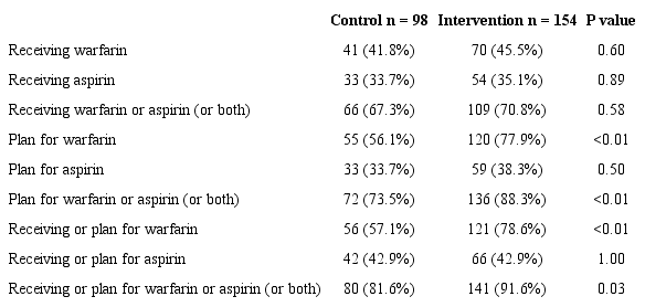 Results: Although antithrombotic prescribing was not significantly higher at discharge in the 252 enrolled subjects (control 67.3% vs. intervention 70.8%; p = 0.58), a significantly greater number of patients had a written discharge plan for antithrombotic therapy (control 73.5% vs. intervention 88.3%; p < 0.01). The adjusted odds ratio that the study group was associated with an improvement in planned or actual warfarin use was 2.46 (95% CI 1.63-3.74). In addition, clinicians adhered to guidelines for antithrombotic therapy in patients with atrial fibrillation more frequently in the intervention group (control 70.4% vs. intervention 88.2%; p < 0.01).