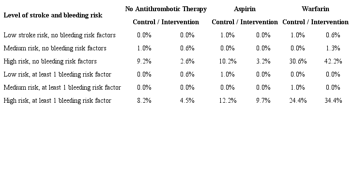 A multivariate logistic regression model was developed to identify and control for confounding factors influencing the use or planned use of antithrombotic therapies. Independent variables considered for inclusion in the model were the intervention, patient age at admission, patient gender, number of stroke risk factors, and the number of bleeding risk factors. Candidate independent variables were required to have a p-value of less than 0.25 for inclusion in the multivariate model. All independent variables were entered into the multivariate model and all possible models were evaluated using the Score Statistic, except for intervention which was forced into the model.45 The final model selected was chosen based on the simplest model that offers a considerable improvement over the next best model. Results were considered statistically significant if the p-value was <0.05. Statistical analysis was performed with SPSS Version 13.0 for Windows.