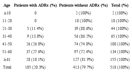 All patients entered the study were classified to two different groups: Patients who developed at least one ADR (ADR patients) and patients who never experienced an ADR (Non-ADR patients). These two groups of patients were compared in sex and age by using chi-square test. Also the duration of drug usage were compared in ADR and Non-ADR patients using t-test. For assessing the relationship between frequencies of ADRs occurred and the number of drugs used, Pearson analysis was performed.