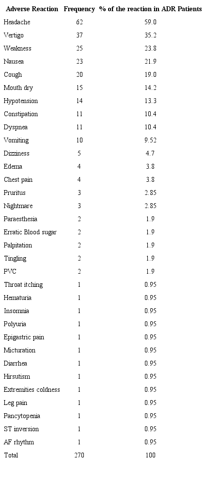 Results: The total number of 518 patients was visited at the clinic. ADRs were detected in 105 (20.3%) patients. The most frequent ADRs were occurred in the age group of 51-60. The highest rate of ADRs was recorded to be induced by Diltiazem (23.5%) and the lowest rate with Atenolol (3%). Headache was the most frequent detected ADR (23%). Assessing the severity and preventability of ADRs revealed that 1.1% of ADRs were detected as severe and 1.9% as preventable reactions. Women significantly developed more ADRs in this study (chi square = 3.978, P<0.05). ADRs more frequently occurred with increasing age in this study (chi square = 15.871, P<0.05). With increasing the number of drugs used, the frequency of ADRs increased (Pearson=0.259, P<0.05).