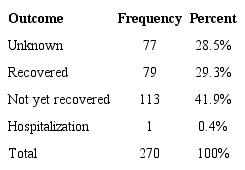 A total of 518 patients, 212 men and 306 women, using cardiovascular medications entered the study. One hundred and five patients (20.3%) including 34 men and 71 women experienced at least one ADR. There were 54 patients (51.4%) who developed more than one ADR. Two ADRs in 26 patients (24.8%), three ADRs in 21 (20%), four ADRs in 5 (4.8%), five ADRs in 1 (1%) and six ADRs in 1 (1%) patient was reported. Detected ADRs were mostly observed in the age group of 51-60 (Table 1). Calcium channel blockers and potassium sparing diuretics had the highest and lowest rate of ADRs respectively (Table 2). The highest rate of ADRs was recorded to be induced by Diltiazem (23.5%) and the lowest rate was related to Atenolol (3%). Central nervous system and Gastrointestinal system disorders were the most frequent system-organ classes affected with ADRs. (Table 3) Headache, vertigo, weakness, nausea and vomiting were the most frequent reactions. (Table 4) Among ADRs evaluated, 1.1% was recognized as serious and 1.9% as preventable ADRs. Causality assessment of ADRs revealed that the most frequent ADRs (75.9%) were recognized to be certain, followed by 19.2% as possible, 3% as probable and 1.9% as unlikely. Withdrawal of suspected drug was necessary in 22.2% of ADR patients, the treatment was continued in 65.6%, the dosage was decreased in 6.3%, the treatment was continued by alternate drug in 3.7% and 2.2% of the patients went through symptomatic therapy. The most common outcome of ADRs was “not yet recovered”, which refers to the ADRs not completely recovered by the end of the study (Table 5).