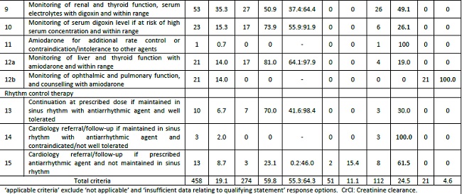 Results: MAT-AF consists of 15 criteria sectioned into antithrombotic, rate control and rhythm control therapy. Content validity was demonstrated for all criteria. Reliability was confirmed with kappa values of 0.84 and 0.91 for inter- and intra-observer agreements. Mean application time for the two observers was 3.9 and 2.4 minutes, which decreased significantly in the second application conducted after a four-week interval (p<0.001). Overall adherence to applicable criteria was 59.8%. Non-adherence was evident for prescription of anticoagulation in patients with a CHA 2 DS 2 VASc score ≥1 (29.5%). Monitoring of laboratory parameters for digoxin was suboptimal. Ophthalmic and pulmonary monitoring and patient counselling regarding amiodarone therapy could not be assessed since relevant records were not readily available.