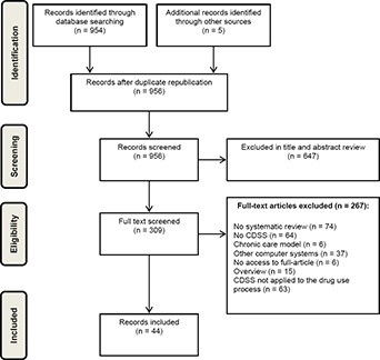 Results: The search retrieved 954 articles. Five articles were added through manual search, totaling an initial sample of 959 articles. After screening and reading in full, 44 systematic reviews met the inclusion criteria. In the medication-use processes where CDSS was used, the most common stages were prescribing (n=38 (86.36%) and administering (n=12 (27.27%)). Most of the systematic reviews demonstrated improvement in the health care process (30/44 – 68.2%). The main positive results were related to improvement of the quality of prescription by the physicians (14/30 – 46.6%) and reduction of errors in prescribing (5/30 - 16.6%). However, the quality of the studies was poor, according to the score used.