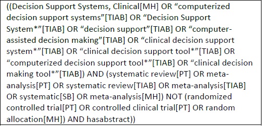 A search for systematic reviews that addressed clinical decision support systems was performed on Medline on December 1, 2015 following Preferred Reporting Items for Systematic Reviews and Meta-Analyses (PRISMA)16,17 and Cochrane18 recommendations. Terms related to CDSS and systematic reviews were used in combination with Boolean operators and search field tags to build the electronic search strategy that is fully provided in Table 1. There was no limitation of date or language for inclusion. Medline was the search engine selected because of its extensive indexation of health journals and wide use by researchers and health professionals from around the world. A manual search was also performed via triage in the references of the included systematic reviews.