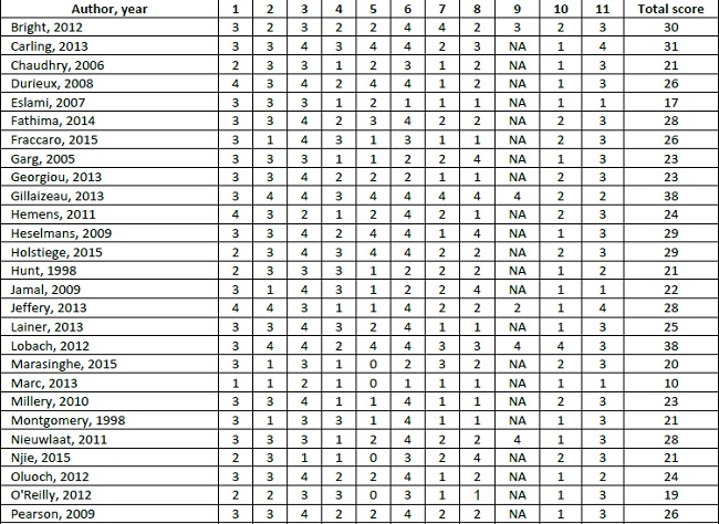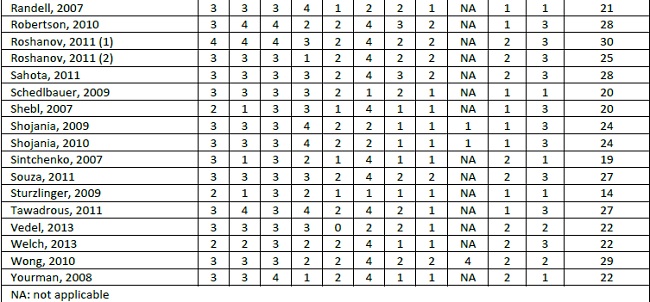 In general, the quality of the included systematic reviews was poor (Table 2), which makes the inference of robust conclusions complicated. The average R-AMSTAR score of the reviews was 24.39 (SD=5.28). Only eight studies performed meta-analysis (18.2%), so the domain 9 was not applicable for the majority of studies, reflecting the low scores found. Seventeen studies scored 22 points or lower, and just five reviews scored higher than 30 points.