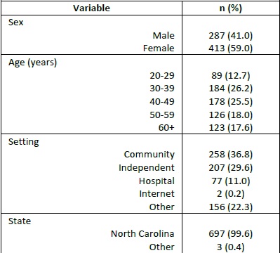 At the time this study was conducted there were 11,599 pharmacists in North Carolina. A total of 704 pharmacists completed the survey, resulting in a 6.3% response rate. The margin of error when using a 95% confidence level was 3.58%. A chi-squared test was performed to determine if the pharmacist sample was reflective of the state’s population of pharmacists by sex and age variables. Results indicated the sample was statistically significantly different (p<0.001) for both variables. A closer inspection of data indicated a discernible underrepresentation from males and persons over 60 years of age. In order to mitigate the sampling bias, auxiliary statistics were obtained from the North Carolina Board of Pharmacy and post-stratification weights were applied to correct for over/under representation based on age and sex variables. After statistical weights were applied to correct for sampling bias, the sample size was adjusted to n=700. Participants were classified by four demographic items: age, gender, pharmacy practice setting and state of primary practice. A breakdown of demographic statistics is presented in Table 1.