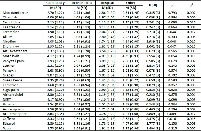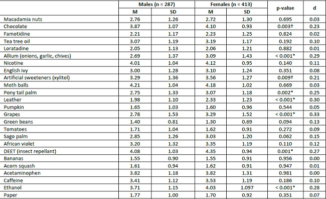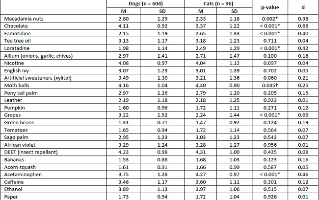 Participants were asked to select either a dog or a cat to establish a frame of reference and then answer all questions with this animal in mind. Results indicate six substances (macadamia nuts, chocolate, famotidine, loratadine, grapes and acetaminophen) resulted in statistically significant differences between dogs and cats (p<0.002). Cohen’s d effect size estimates ranged from 0.38 to 0.68 with most effect sizes approximating 0.50 in magnitude indicating a moderate effect size for each statistically significantly different pair. Table 2 provides a breakdown of full results and p-values based on participant responses by dog and cat.