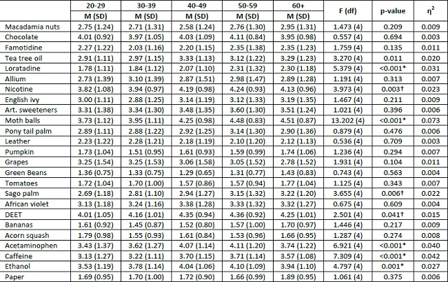 An ANOVA was performed to determine if participants’ responses varied by age. After a Bonferroni adjustment, five substances resulted in statistically significant differences (p<0.002) based on age (loratadine, moth balls, acetaminophen, caffeine and ethanol). Table 4 presents all results and p-values. In 15 instances, older pharmacists (age 50 years and older) were more likely to indicate concern for each potential toxin. Eta-squared effect size estimates indicated small (0.01) to moderate (0.06) effect sizes.4