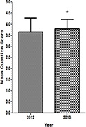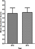 For HCAHPS question 14, 220 individuals responded in 2012 and 250 individuals responded in 2013. Question 14 asks “During this hospital stay, how often did the hospital staff do everything they could to help you with your pain?” Figure 2 shows a comparison of mean HCAHPS survey scores for question 14. This data was not normally distributed (D’Agostino & Pearson omnibus normality test), necessitating a non-parametric statistical approach. There was a significant 3.68% increase in the 2013 mean score compared to 2012 (mean2012=3.66, SD=0.63 versus mean2013=3.80, SD=0.43, p=0.018, Mann-Whitney U test).