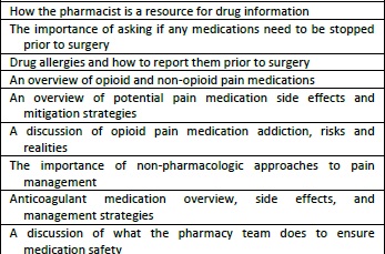 A multidisciplinary preoperative patient education class involving pharmacists began in 2013. Pharmacists participate in the preoperative class for surgical patients and counsel patients postoperatively on their medication regimens. The class is approximately one and a half hours in duration and involves nurses, physical therapists, discharge planners, and pharmacists discussing how to prepare for surgery and what to expect following the procedure. Pharmacists are responsible for discussing the medications they will likely be prescribed and how to manage potential side effects. They counsel each patient following the procedure on their pain medications. The post-surgical patients at our facility generally receive hydromorphone for breakthrough pain and hydrocodone-acetaminophen combination products as needed for pain. Ketorolac (renally adjusted as appropriate) is also used in a fixed, scheduled number of doses after the procedure. Patient-controlled analgesia, usually hydromorphone, can also be added in many situations.