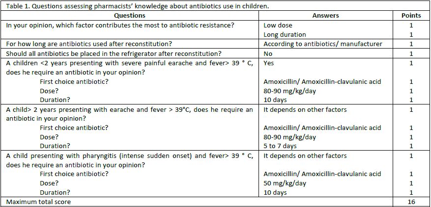 Our findings revealed that female pharmacists had an increased knowledge concerning antibiotics use in children compared to males, in contrast to another study 25 that showed no gender differences. Unfortunately, we did not inquire pharmacists about their parental status which might be of interest to explain the results. In fact, a higher percentage of mothers among female pharmacists would lead to a better knowledge and expertise in pediatrics.